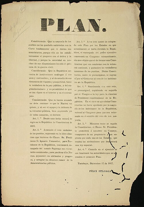 En una situación de tensión por el rechazo de parte de la población a varias de las Leyes de Reforma, que buscaban sobre todo limitar el poder de la Iglesia católica a finales de ese mismo año, el presidente aceptó el Plan de Tacubaya, elaborado por Félix Zuloaga y otros miembros del partido conservador.