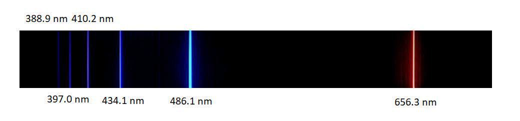 Nótese que el espectro del hidrógeno mostrado en la figura contiene unas líneas en ultravioleta, las dos de la extrema izquierda, cuyas longitudes de onda son 397.0 nm y 388.9. nm.