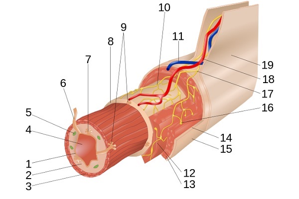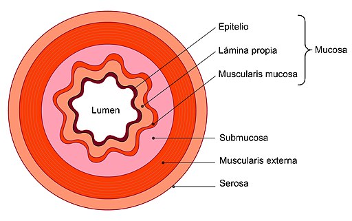 - Mucosa: compuesta por un epitelio, una lámina propia y la muscularis mucosae con dos capas musculares lisas. También contiene glándulas, vasos linfáticos y nódulos linfoides.