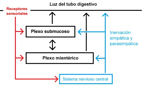 La organización general del sistema nervioso entérico y del sistema autónomo que inerva el tubo digestivo es compleja e interconectada.