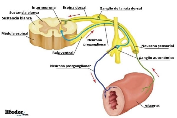 El recorrido de las fibras destinadas al control visceral ocurre por la interacción entre pares de neuronas, una preganglionar y otra postganglionar.