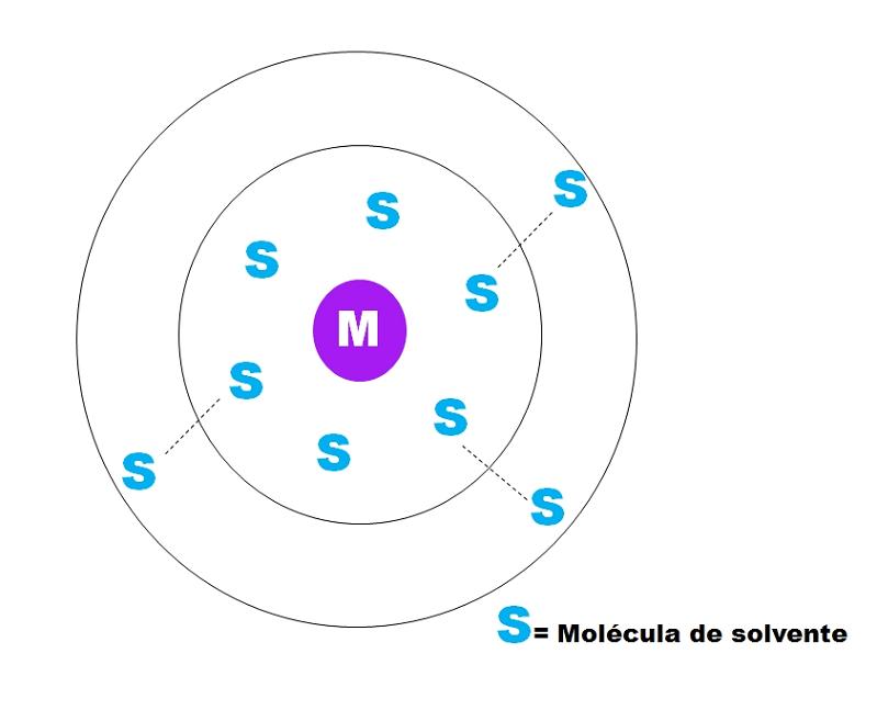 Nótese que M se encuentra rodeado de seis moléculas de S, las cuales conforman lo que se conoce como esfera de solvatación primaria. Otras moléculas de S a mayor distancia interactúan por fuerzas de Van der Waals con las primeras, formando una esfera de solvatación secundaria, y así sucesivamente hasta que no sea evidente algún ordenamiento.