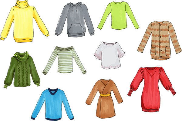 Bata, abrigo, chaqueta, campera, suéter, franela, remera, musculosa, camisa, buzo, cuello de tortuga, chamarra, ruana, blusa, blúmer, pantaleta, bikini, pantalón, short, pantaloncillos, traje de baño, hilo dental, bermudas, vestido, chal, guantes, zapatos, americana, sandalias, medias, calcetines, zuecos, botas, alpargatas, cachucha, gorra, sombrero, boina, correa, cinturón, bluyín, tejano,  calzón, bufanda, velo, sari, estola, anorak, guantes.