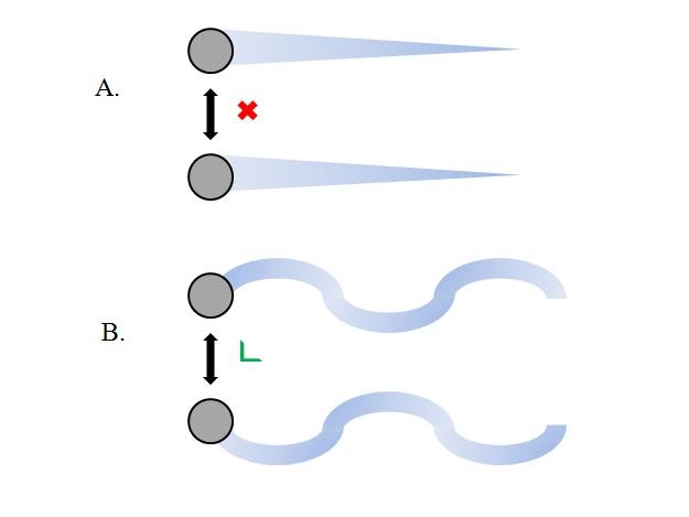 Las trayectorias lineales de la imagen superior (A.) demuestran este postulado, mientras que si las trayectorias son curvas (B.), evidencia que existen interacciones que no pueden ignorarse entre las partículas.