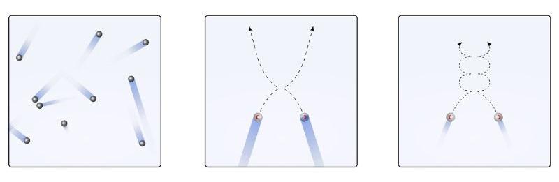 En estas condiciones, las interacciones entre las esferas cobran mayor importancia, a tal punto que enlentecen momentáneamente sus velocidades. Cuanto más cerca estén de la licuefacción, más curvas se tornan sus trayectorias (recuadro de la derecha), y sus colisiones son menos energéticas.