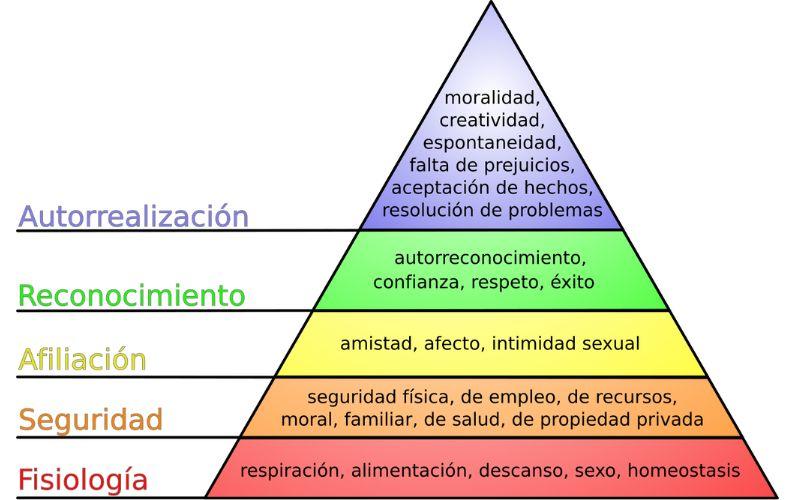 - Pirámide de Maslow. Propuesta por Abraham Maslow en su trabajo “Una teoría de la motivación humana” de 1943. En este artículo, el investigador defendía que las necesidades son jerárquicas, es decir, las más básicas deben cumplirse antes de que se activen las de niveles superiores. Así, la mayoría de individuos comienzan su vida actuando desde los niveles más bajos de motivación, y según van cubriendo sus necesidades, pasan a los siguientes. Según Maslow, los tipos de motivación que existen se organizan en cinco niveles distintos: