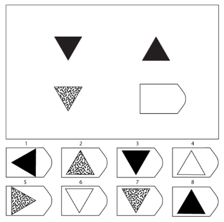 13. La 2 es la correcta. Nótese que los triángulos de la izquierda apuntan hacia abajo. Los de la derecha apuntarán hacia arriba, siguiendo el patrón de formas internas del triángulo.