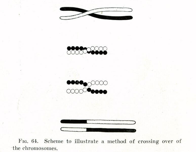 Morgan advirtió que al producirse la meiosis había parejas de cromosomas que podían intercambiar entre sí algunos fragmentos equivalentes. Así, se intercambiaban fragmentos de ADN y, por lo tanto, se producía la llamada recombinación genética.