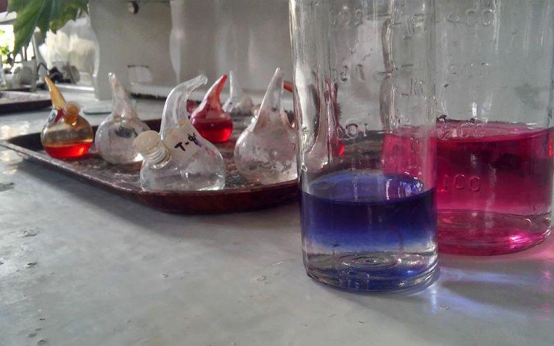 El frasco con el líquido azul contiene timolftaleína, y el colorado, rojo de metilo. Fuente: ElNokko, CC BY-SA 4.0, Wikimedia Commons
