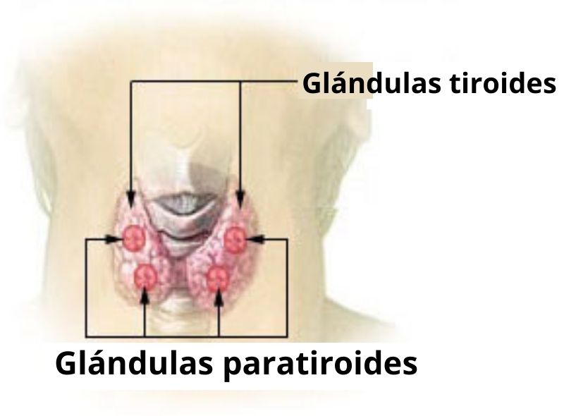 - Tiroides: se ubica en el cuello y participa de la secreción de las hormonas tiroxina, triyodotironina y calcitonina, que influyen sobre el metabolismo.