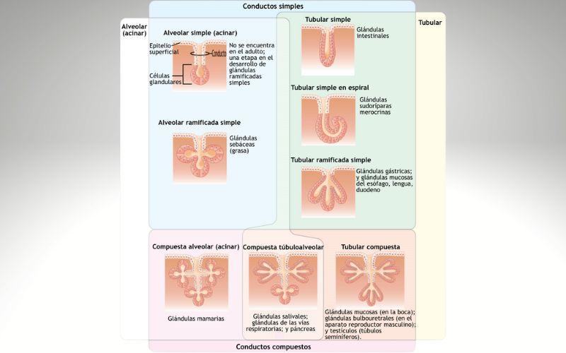 - Glándulas exocrinas multicelulares: su estructura está conformada por “racimos” de células secretoras que pueden estar organizadas de distintas maneras. Puesto que son muchas células en constante contacto y comunicación, se comportan como un órgano de secreción. Las glándulas multicelulares pueden ser simples o compuestas, si sus conductos tienen ramificaciones o no; o pueden ser tubulares, acinares, alveolares o tubuloalveolares, dependiendo de la apariencia de sus unidades secretoras.