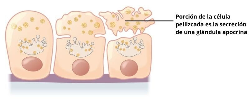 - Glándulas apocrinas: glándulas cuyas células liberan parte de su contenido citosólico con cada secreción (ejemplo, las glándulas mamarias).