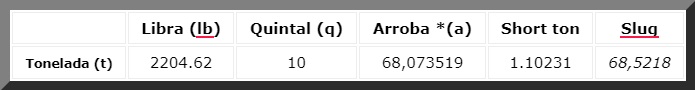 Para transformar toneladas a cualquiera de las unidades que están en la primera fila, basta con multiplicar el valor por el factor de conversión que aparece en la columna correspondiente.
