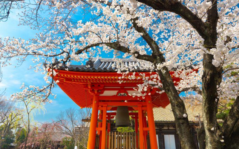 Templo japonés y un cerezo en flor. Fuente: Con licencia