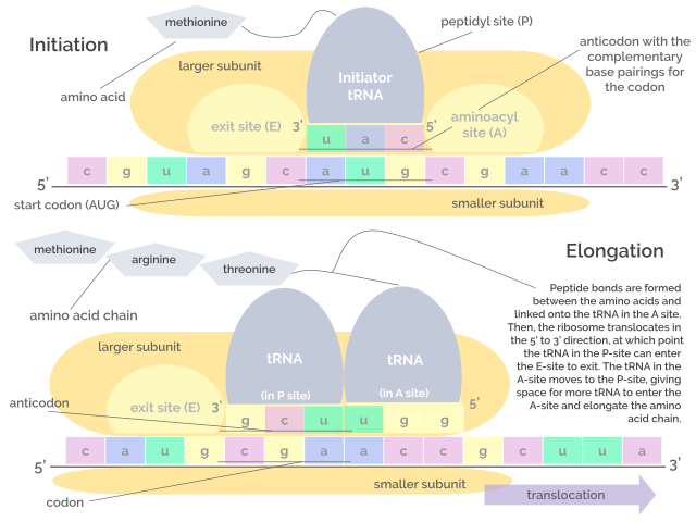 Representación gráfica de las fases de iniciación y elongación de la traducción (Fuente: Jordan Nguyen / CC BY-SA (https://creativecommons.org/licenses/by-sa/4.0) vía Wikimedia Commons)