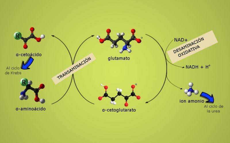 - Paso previo a la eliminación del nitrógeno. Es un paso clave antes de la desaminación oxidativa y del ciclo de la urea. Facilita la eliminación del nitrógeno de forma segura.