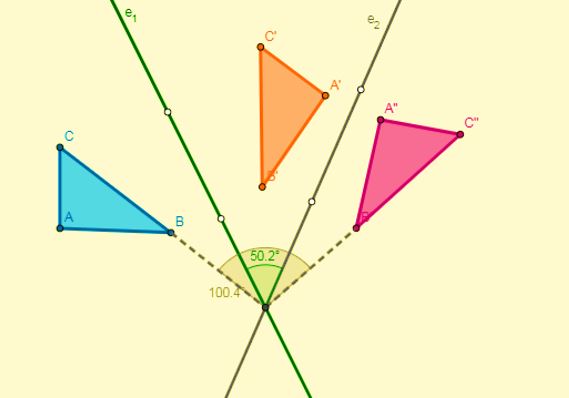 - Si se aplican dos simetrías con respecto a dos ejes que se cortan en el punto O (centro), se obtendrá una rotación con centro en O y su ángulo será el doble del ángulo que forman los ejes: