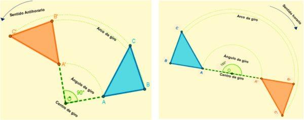 Son aquellas isometrías que permiten a la figura girar todos los puntos de un plano. Cada punto gira siguiendo un arco que tiene un ángulo constante y un punto fijo (centro de giro) determinados.