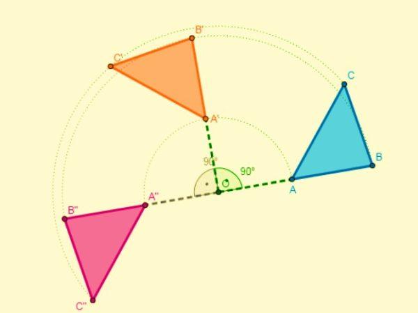 Es decir, toda rotación va a estar definida por su centro de rotación y ángulo de giro. Cuando una figura se transforma por rotación, mantiene la medida de sus ángulos y lados.