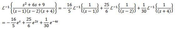 Para la segunda transformada inversa aplicamos fracciones parciales para reescribir la función F(s) y luego la propiedad de la linealidad, obteniendo