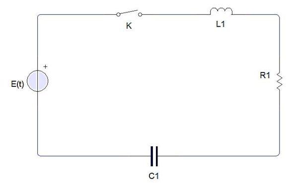 Un interruptor, una batería o fuente, un inductor, una resistencia y un capacitor. Cuando el interruptor es cerrado se produce una corriente eléctrica que se denota por i(t). La carga del capacitor se denota por q(t).