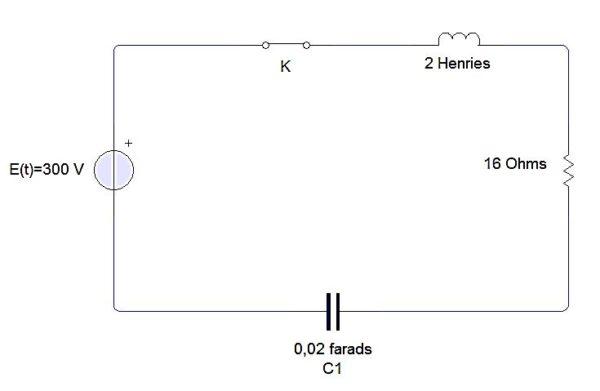Un inductor, un capacitor y una resistencia se conectan a una batería E, como se muestra en la figura. El inductor es de 2 henries, el capacitor de 0,02 farads y la resistencia de 16 onhmios. En el instante t = 0 se cierra el circuito. Encontrar la carga y la corriente en cualquier tiempo t > 0 si E = 300 voltios.