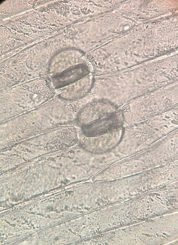 - Los estomas. Este proceso es posible por la existencia de unas estructuras que interrumpen la continuidad de la superficie foliar (epidermis) y que se conocen como estomas. Los estomas permiten la liberación controlada del vapor de agua desde las hojas, evitando la evaporación por difusión directa desde los tejidos epidérmicos, que ocurre pasivamente y sin ningún tipo de control. Un estoma consiste en dos células guarda, que tienen forma de salchicha o de riñón, las cuales forman una estructura en forma de poro, cuyo cierre o apertura está controlado por diferentes estímulos hormonales y ambientales: