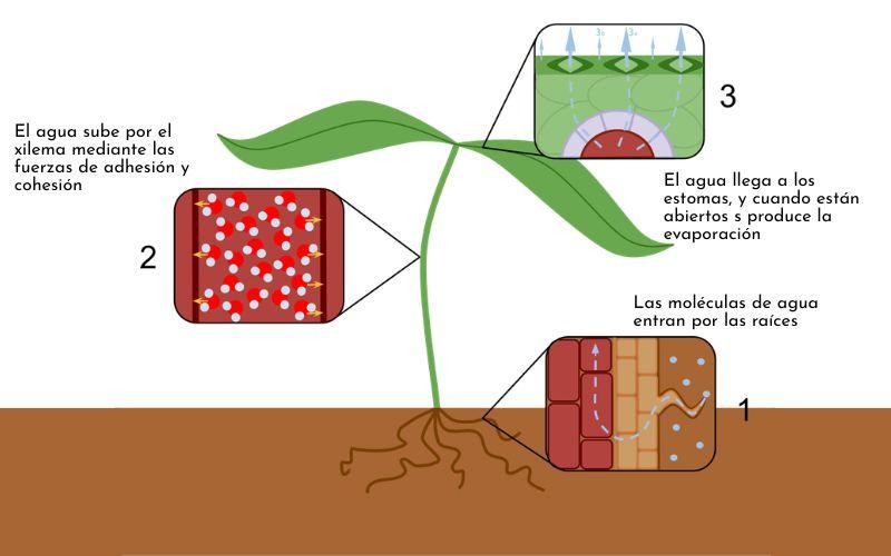 Aclarado el concepto de los estomas, el proceso de transpiración, entonces, se da de la siguiente manera: