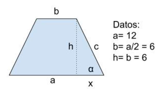 Se tiene un trapecio isósceles cuya base mayor es el doble de la menor y su base menor es igual a la altura, la cual es 6 cm. Determinar: