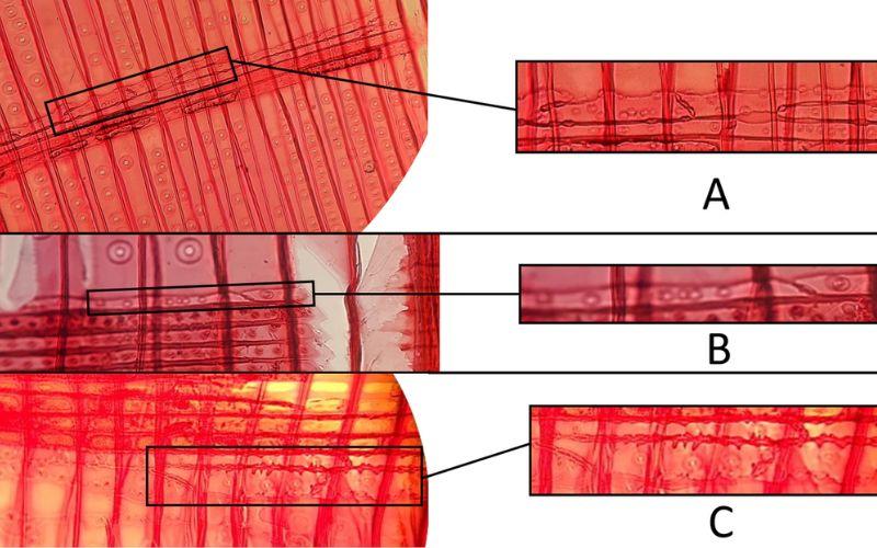 Traqueidas radiales de (A) picea, (B) alerce y (C) pino escocés. Fuente: Eriklo 01, CC BY-SA 4.0, Wikimedia Commons