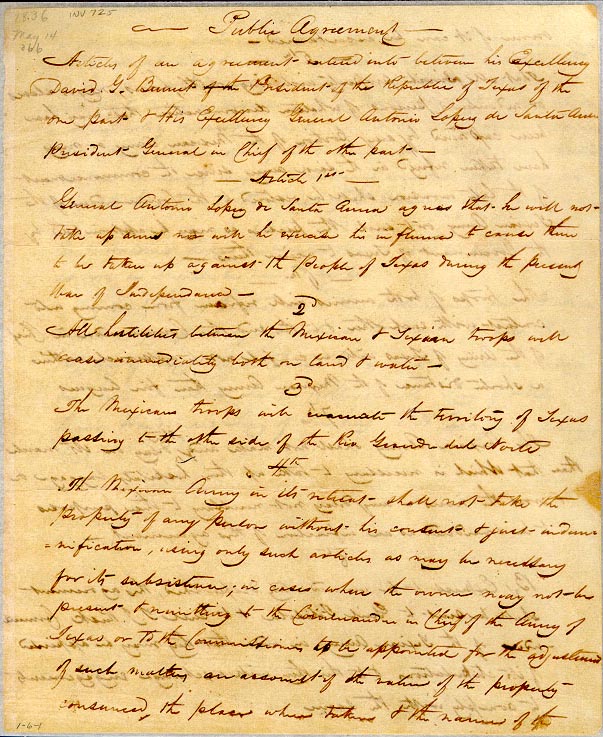 Además, Santa Anna se comprometía a no tomar las armas contra los texanos y a no influir en otros para hacerlo.
