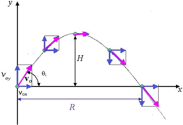 Se arroja un objeto (el proyectil) formando un ángulo a con la horizontal y con velocidad inicial vo como se muestra en la figura. No se toma en cuenta la resistencia del aire. El movimiento se puede tratar como dos movimientos independientes y simultáneos: uno horizontal con velocidad constante, y otro vertical bajo la acción de la gravedad.