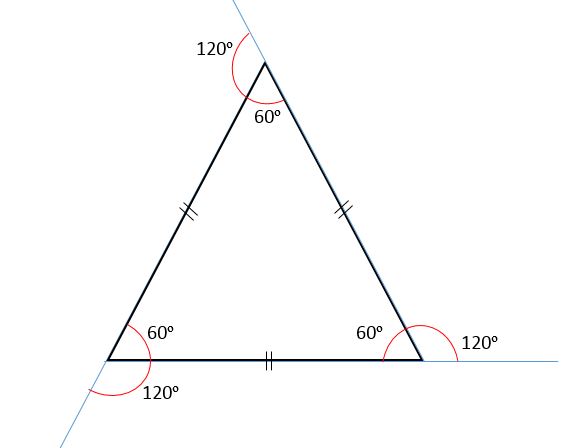 La suma de los ángulos externos siempre será igual a 360o, por lo tanto cada ángulo externo va a medir 120o. Eso es debido a que los ángulos internos y externos son suplementares, es decir, al sumarlos siempre serán iguales a 180o.