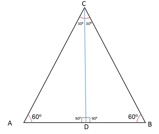 Al trazar el segmento CD, se divide el ángulo del vértice en dos ángulos iguales de 30o, el ángulo del vértice A sigue midiendo 60o y la recta CD forma un ángulo de 90o con respecto al punto medio D.