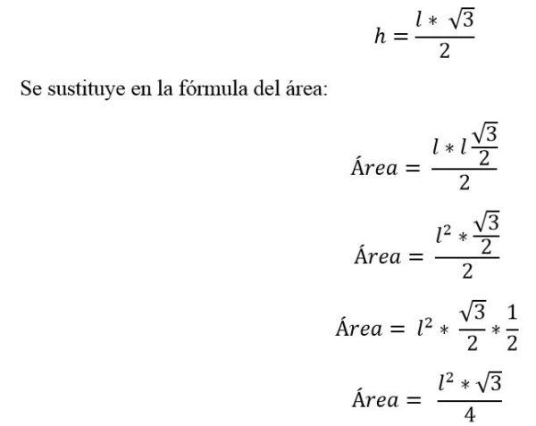Para determinar el área de ese triángulo equilátero es necesario calcular la altura, sabiendo que al trazarla, esta divide el triángulo en dos triángulos rectángulos iguales.