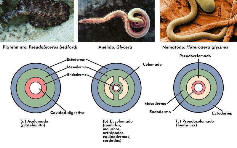 En los animales triblásticos se observa un patrón de organización creciente que se puede subdividir basándose en la presencia o ausencia de una cavidad corporal llamada celoma.