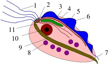Asimismo, se observan unas estructuras conocidas como blefaroplastos, corpúsculos basales a partir de los cuales se originan los flagelos.