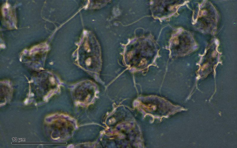 Visto al microscopio se puede observar que presenta un total de cinco flagelos, de los cuales uno se encuentra en la superficie celular, formando una especie de membrana ondulante. El resto de los flagelos se disponen orientados hacia el polo anterior.