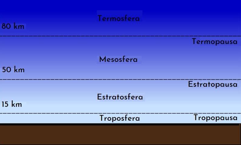 La troposfera se extiende desde la superficie de la Tierra hasta los 15 km de altura. La estratosfera va desde los 15 km hasta los 50 km de altura. La mesosfera abarca desde los 50 km hasta los 80 km de altura. La termosfera desde los 80 km hasta los 500 km, y la exosfera desde los 500 km hasta los 10.000 km de altura. Esta última es el límite con el espacio interplanetario.
