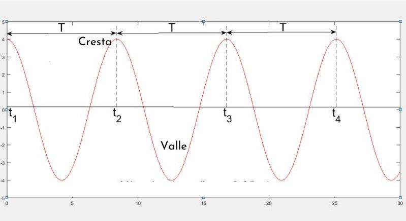 El tiempo que transcurre de un valle-cresta-valle, estando en una posición fija, se le denomina período de la oscilación y este tiempo se denota con una t mayúscula: T.
