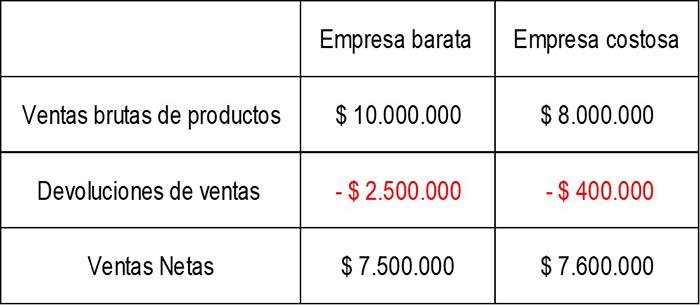 Como se puede observar, la empresa barata parece ser una compañía ligeramente más grande, tomando como perspectiva las ventas brutas, vendiendo productos por un monto de $2.000.000 más que la empresa costosa.