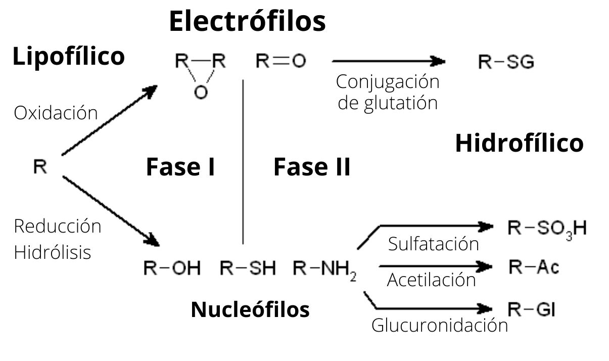 El metabolismo de los xenobióticos se puede agrupar en dos procesos o fases. La primera tiene como reacción principal la hidroxilación y la segunda incluye la conjugación de los productos hidroxilados. Estos procesos tienen lugar principalmente en el hígado, aunque algunas reacciones iniciales pueden ocurrir en la barrera epitelial de la piel y en otros tejidos como los pulmones.