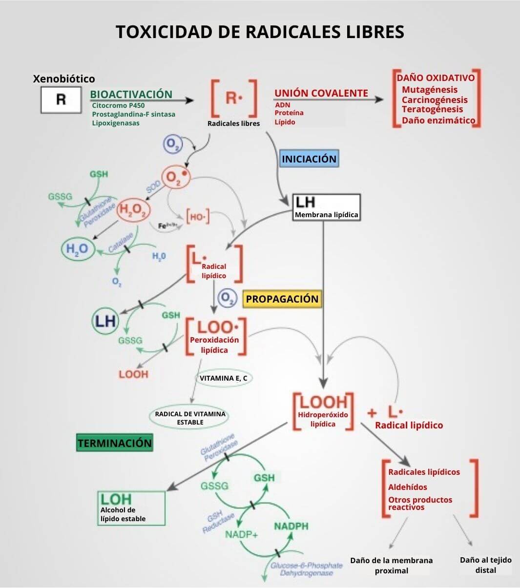 Los compuestos xenobióticos pueden reaccionar con las macromoléculas intracelulares como el DNA (o directamente con las estructuras celulares) causando daños y/o lesiones. Para contrarrestar estos efectos nocivos el organismo tiene dos sistemas de defensa: unas enzimas de detoxificación y los sistemas antioxidantes.